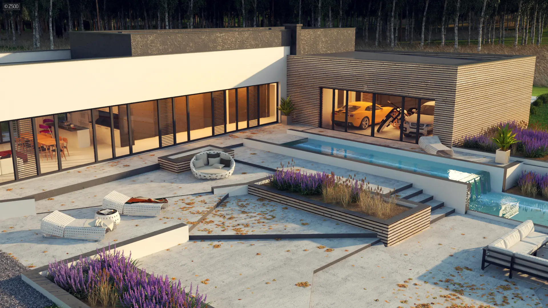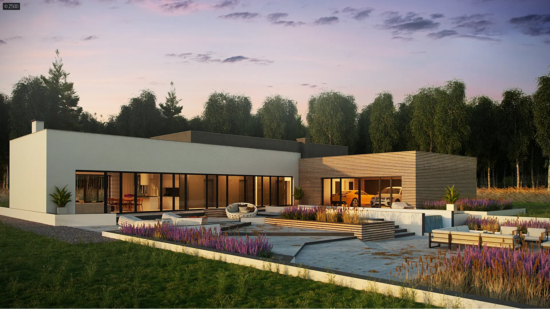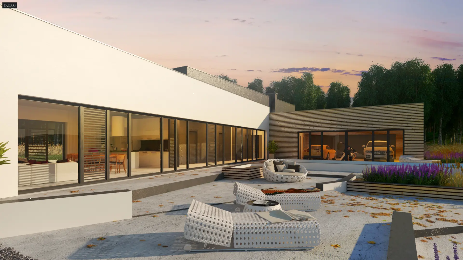 Nowoczesny autorodzinny dom w kształcie litery L, z płaskim dachem, dużymi przeszkleniami i trzystanowiskowym garażem przeszklonym od strony ogrodu. Elewację zdobioną białym tynkiem uświetnia połączenie dużych przeszkleń z drewnianymi panelami. Dwupoziomowy basen stanowi dopełnienie najwyższej jakości gustu i dobrego smaku. Możemy spędzać przy nim czas w ciepłe, letnie dni.