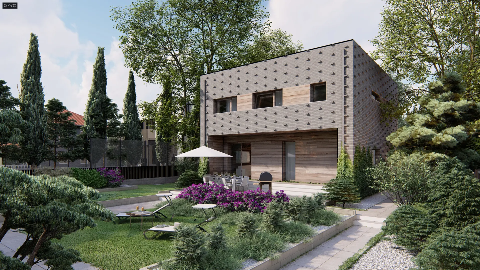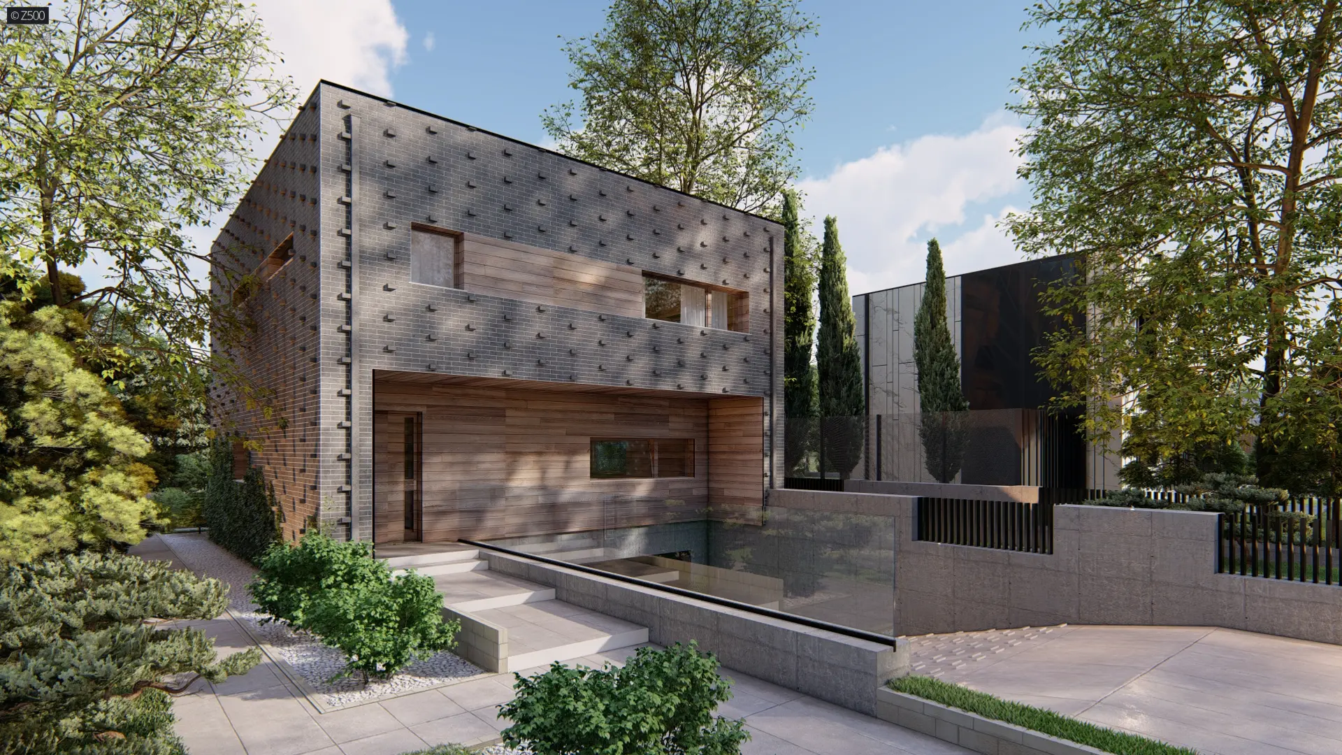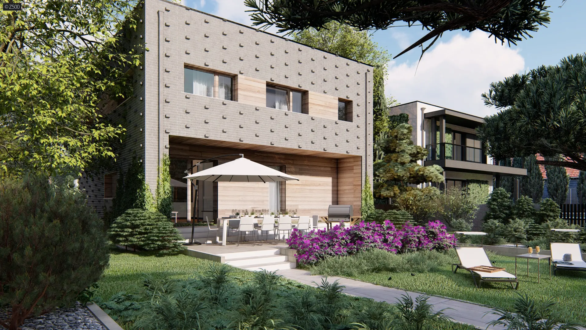 Zx216 to nowoczesny, funkcjonalny dom o prostej bryle. Posiada dach płaski oraz stropy w konstrukcji żelbetowej dzięki czemu uzyskano większe rozpiętości pomiędzy ścianami nośnymi. Dom dzięki prostej bryle jest tani w utrzymaniu. Dodatkowo na zmniejszenie kosztów wpływa pompa ciepła jako główne źródła ciepła. Duże nowoczesne horyzontalne okna zapewniają dobry dostęp światła dziennego.