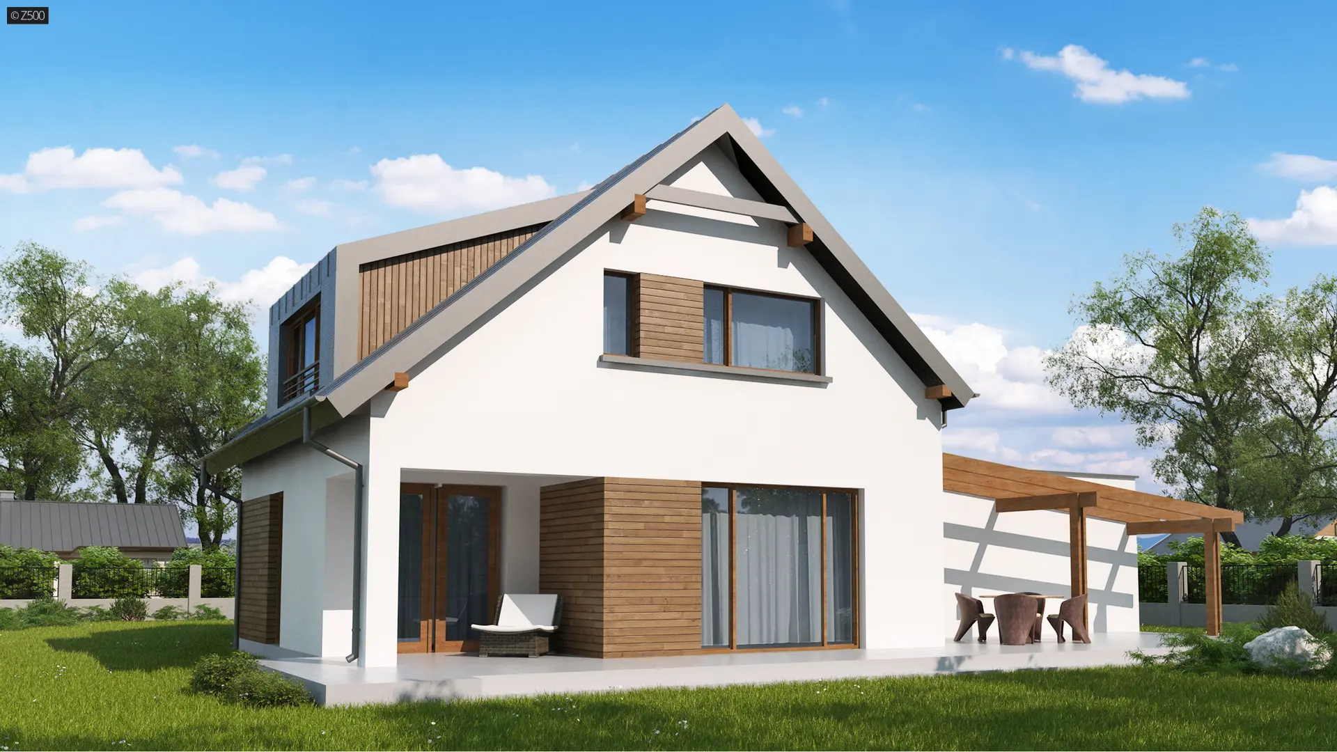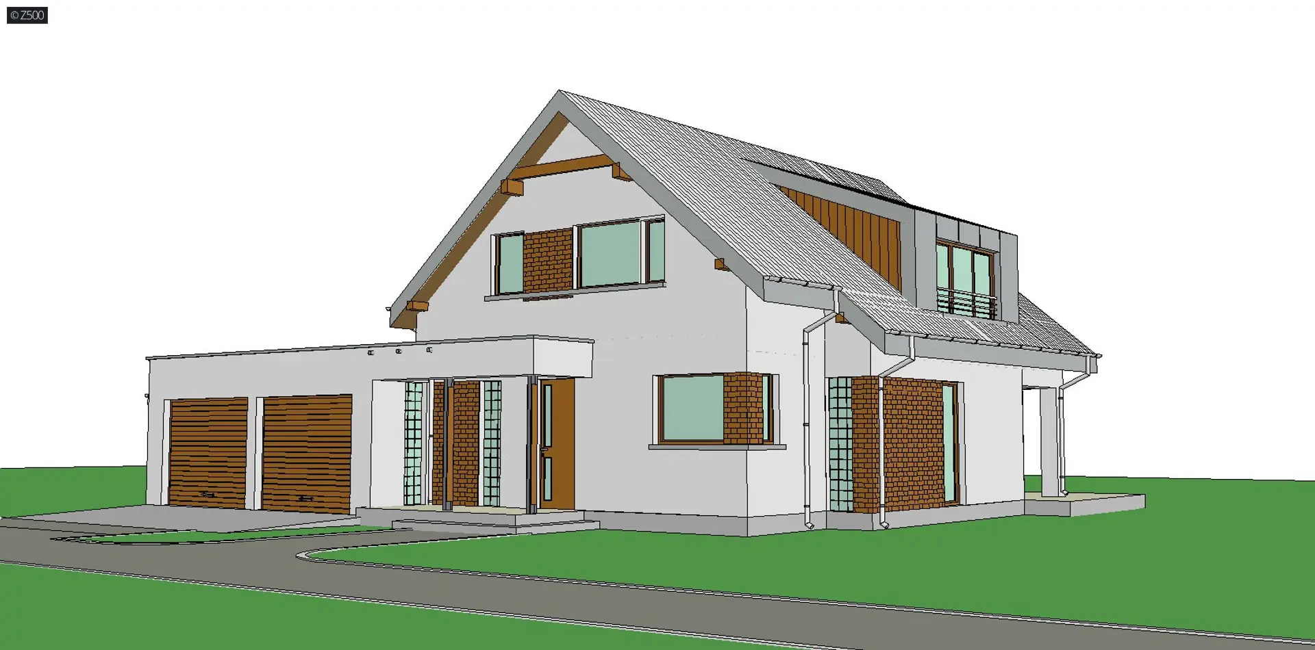 Dom nowoczesny z dachem dwuspadowym oraz garażem dwustanowiskowym od frontu.