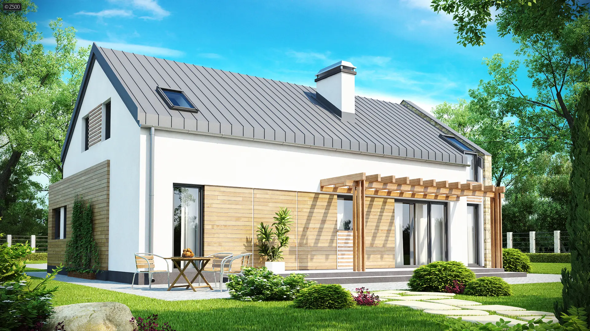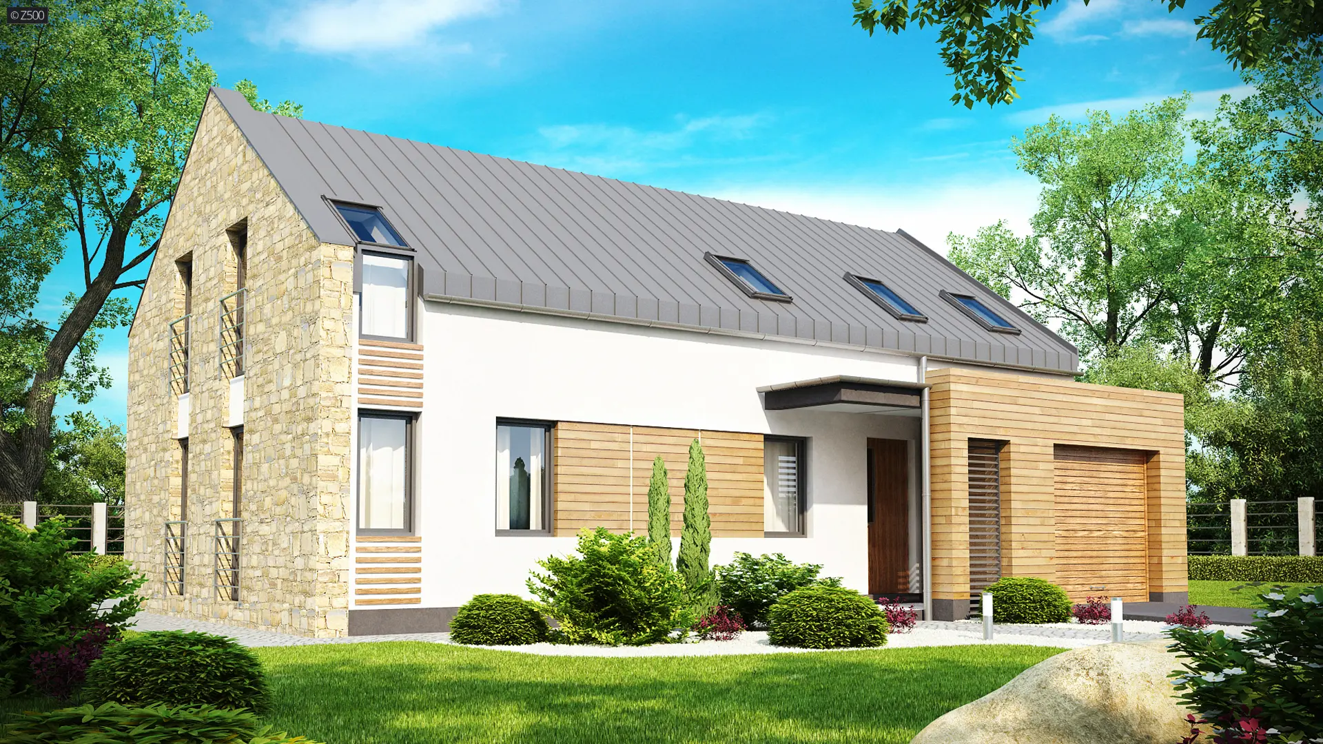 Zx38 to dom o zgrabnej formie. Ciekawe zestawienie różnych materiałów na elewacjach oraz rezygnacja z tradycyjnej formy dachu z okapem podkreślają nowoczesny charakter tego projektu. Wysunięty przed bryłę domu garaż z ciekawą formą zadaszenia tworzą atrakcyjną strefę wejściową.