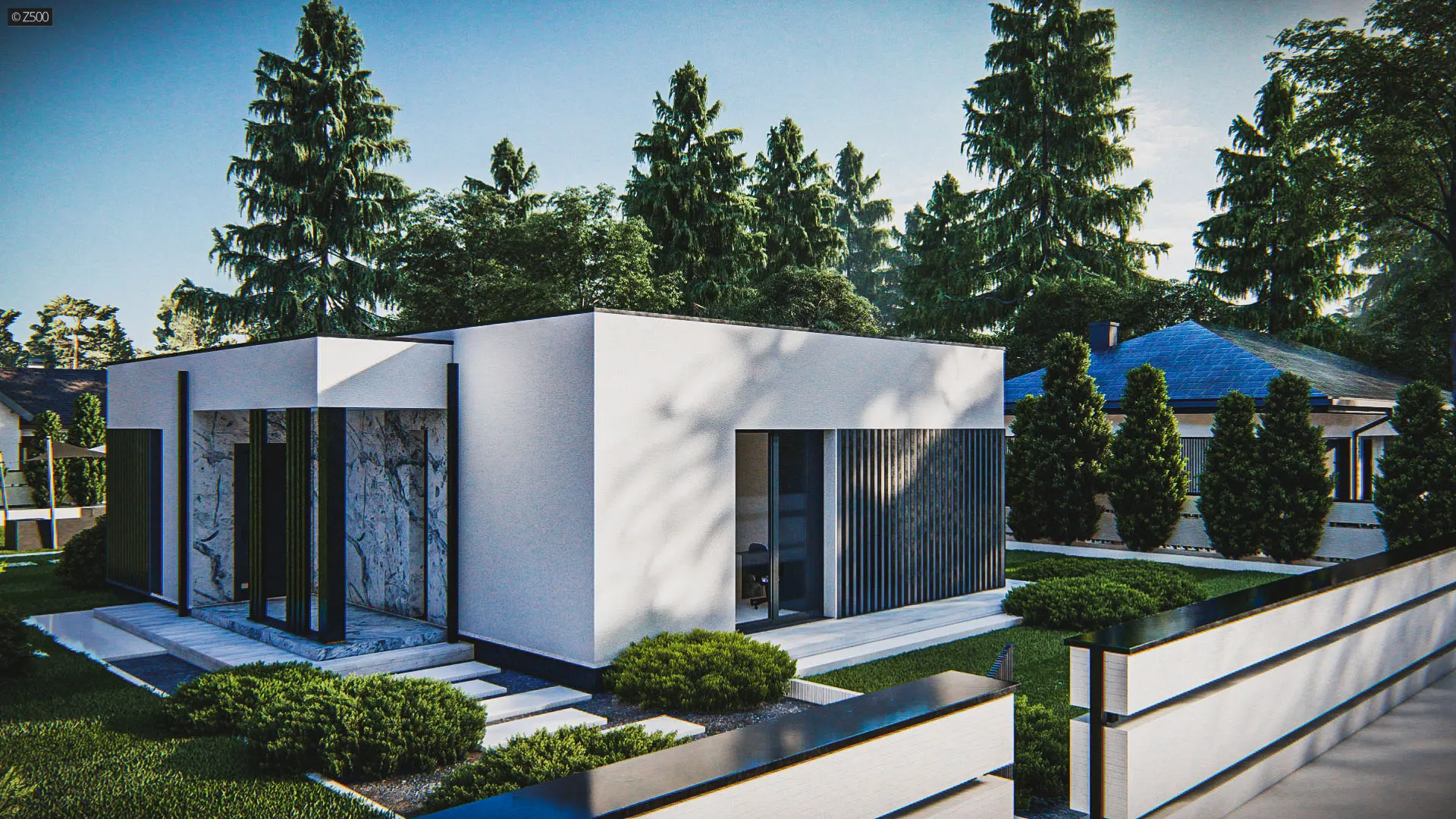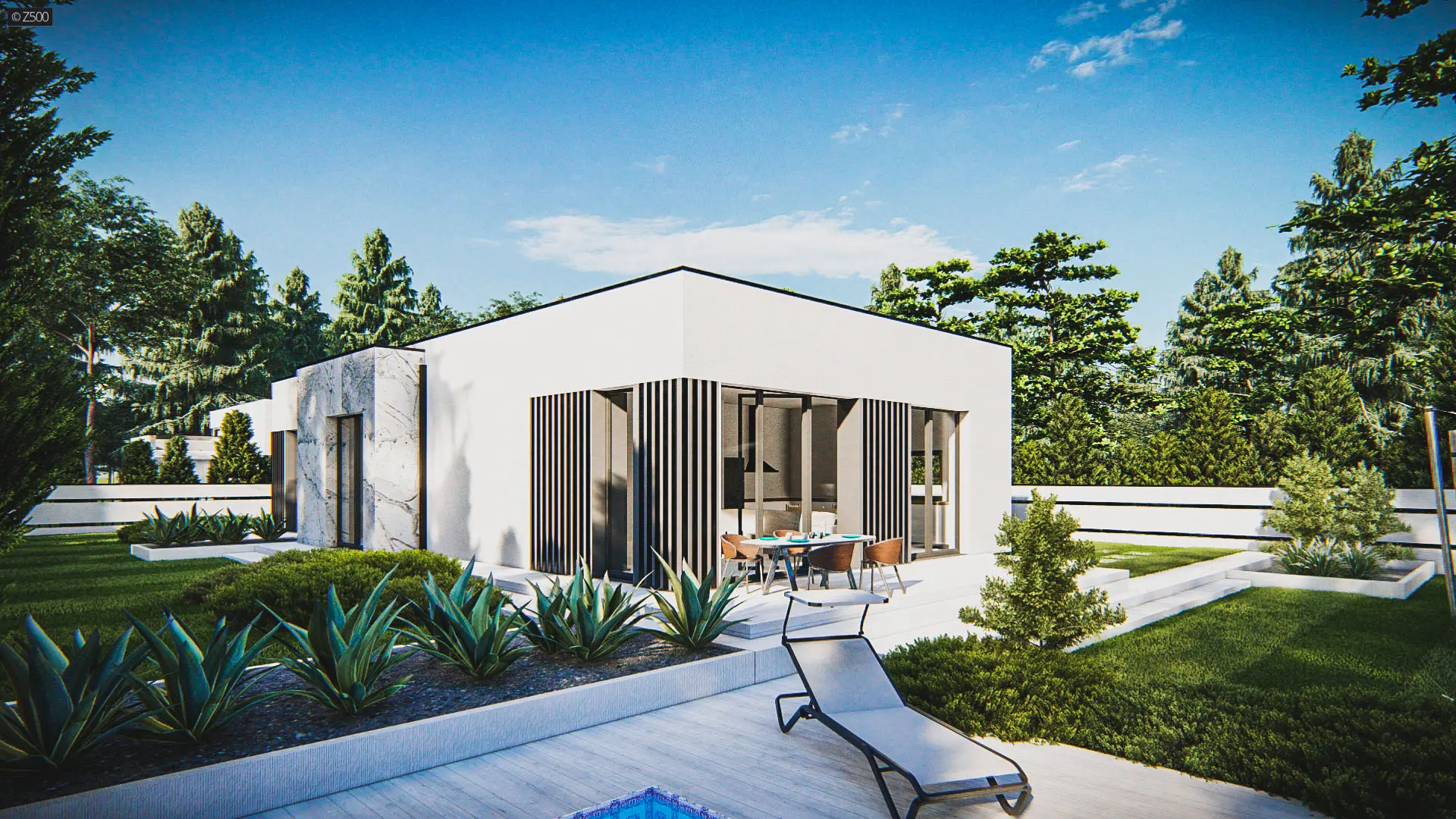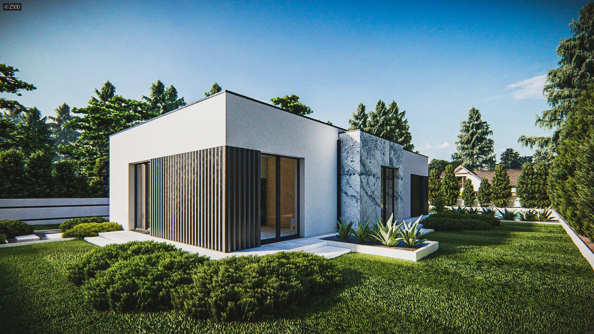 Dom parterowy, współczesny, z dużymi przeszkleniami i ozdobnymi pionowymi deskowaniami. Całość wraz z wykuszami pokryto dachem płaskim. Elewacje utrzymano w jasnej kolorystyce. Biały tynk uzupełniono jasnym kamieniem.