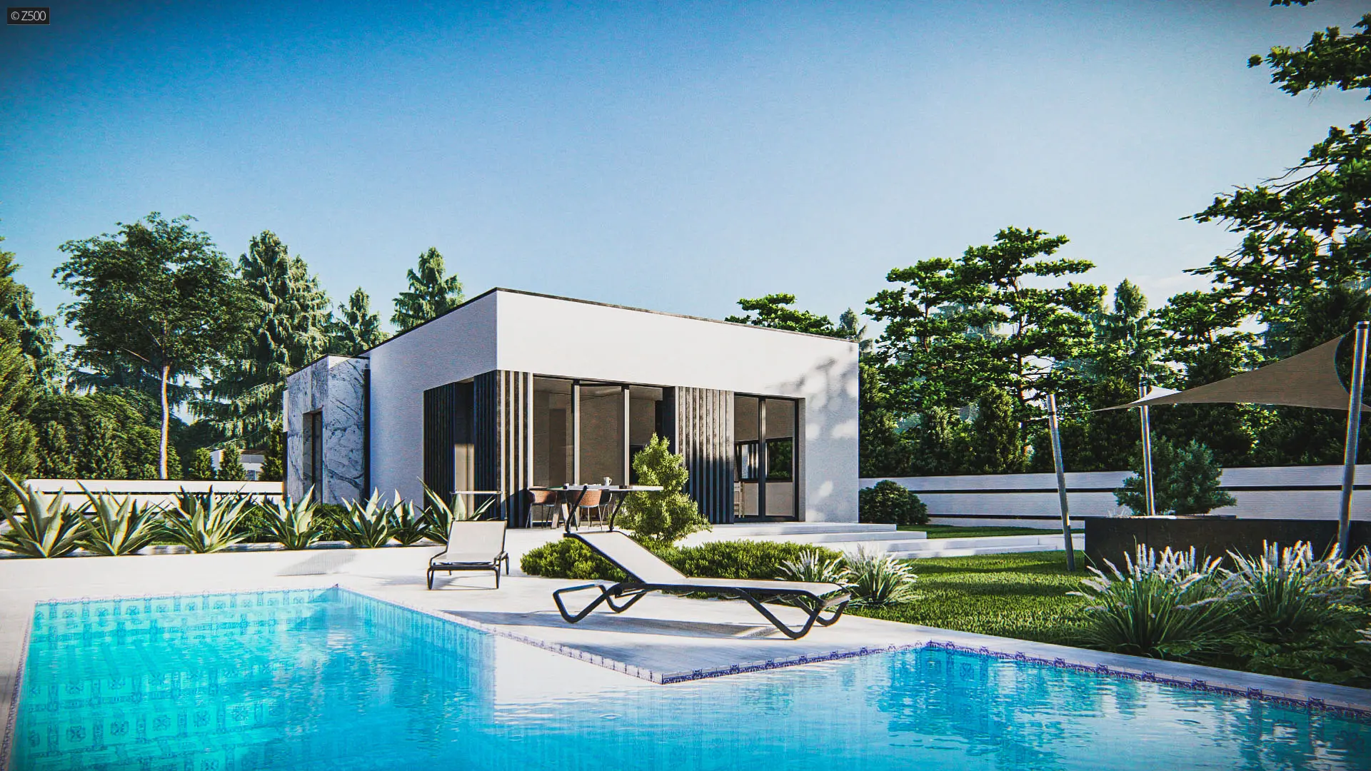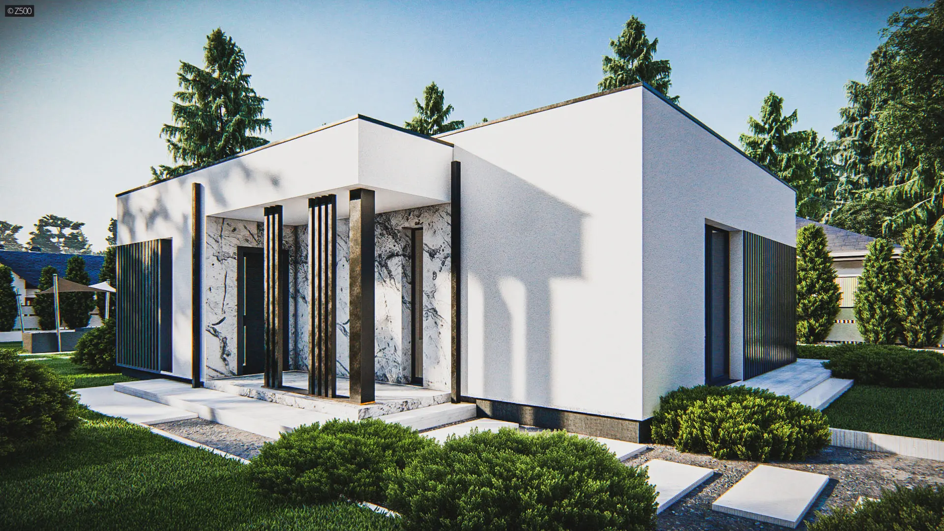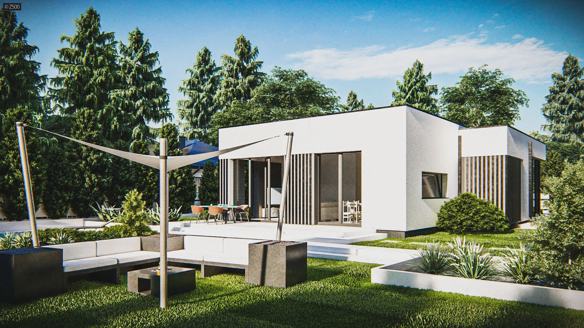 Dom parterowy, współczesny, z dużymi przeszkleniami i ozdobnymi pionowymi deskowaniami. Całość wraz z wykuszami pokryto dachem płaskim. Elewacje utrzymano w jasnej kolorystyce. Biały tynk uzupełniono jasnym kamieniem.