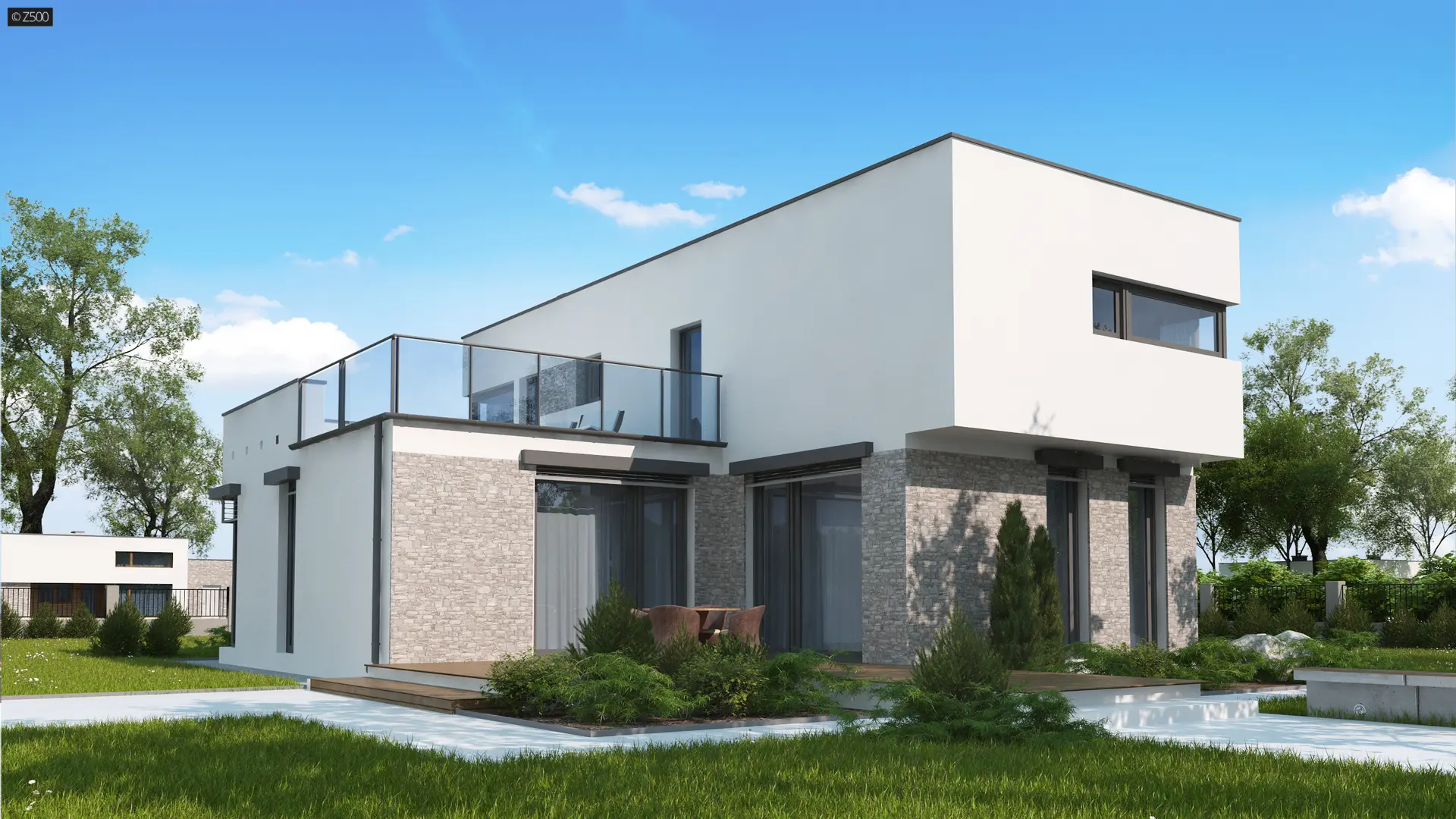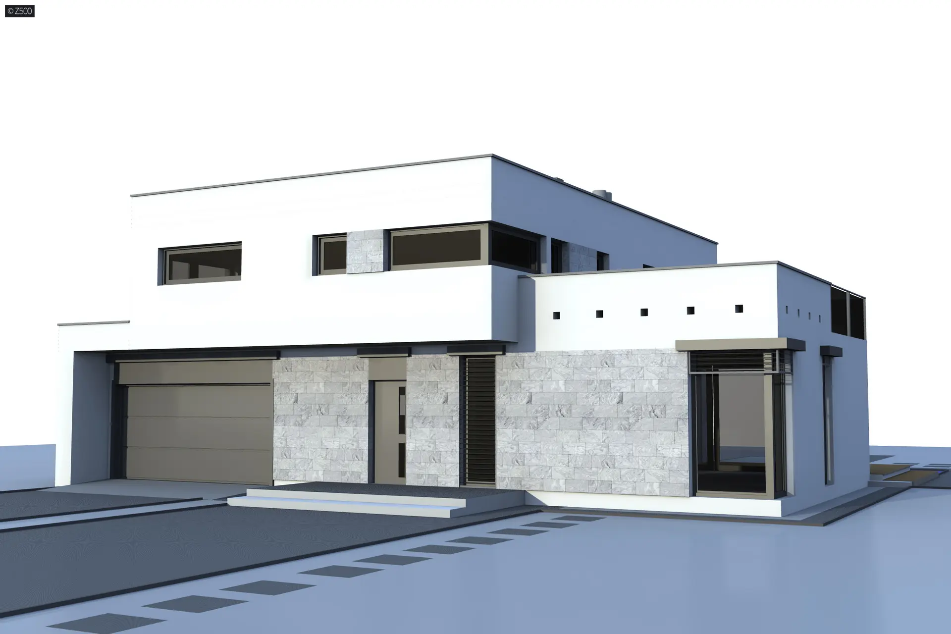 Projekt domu nowoczesnego Zx46 GL2 wyróżnia się nowoczesną, kubiczną bryłą oraz detalami z jasnego kamienia.