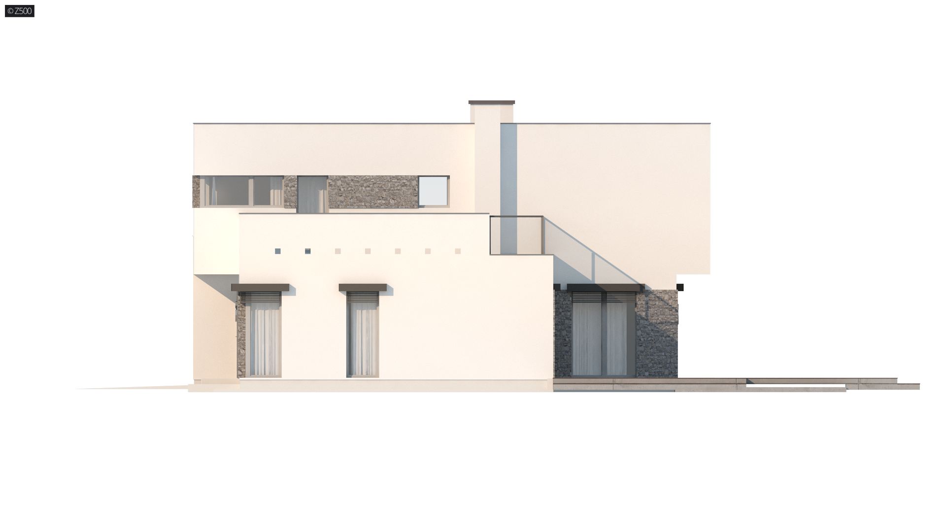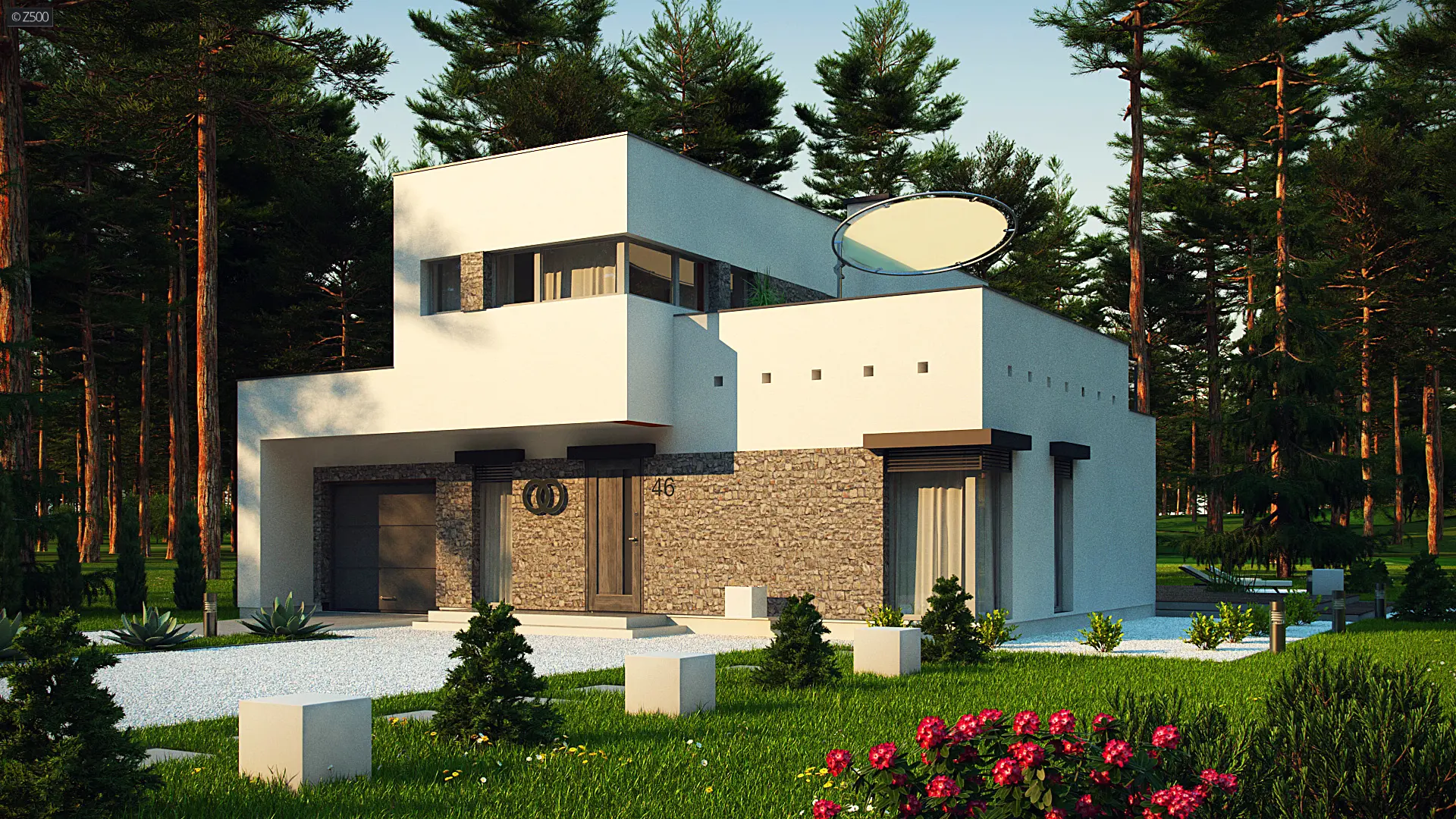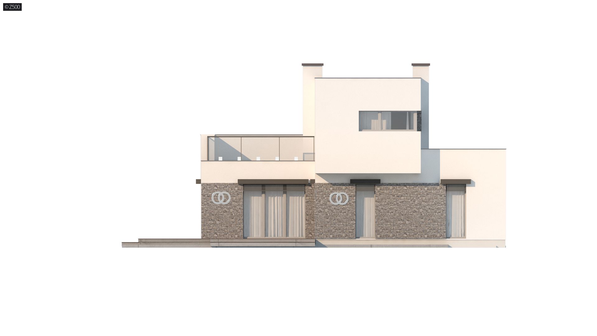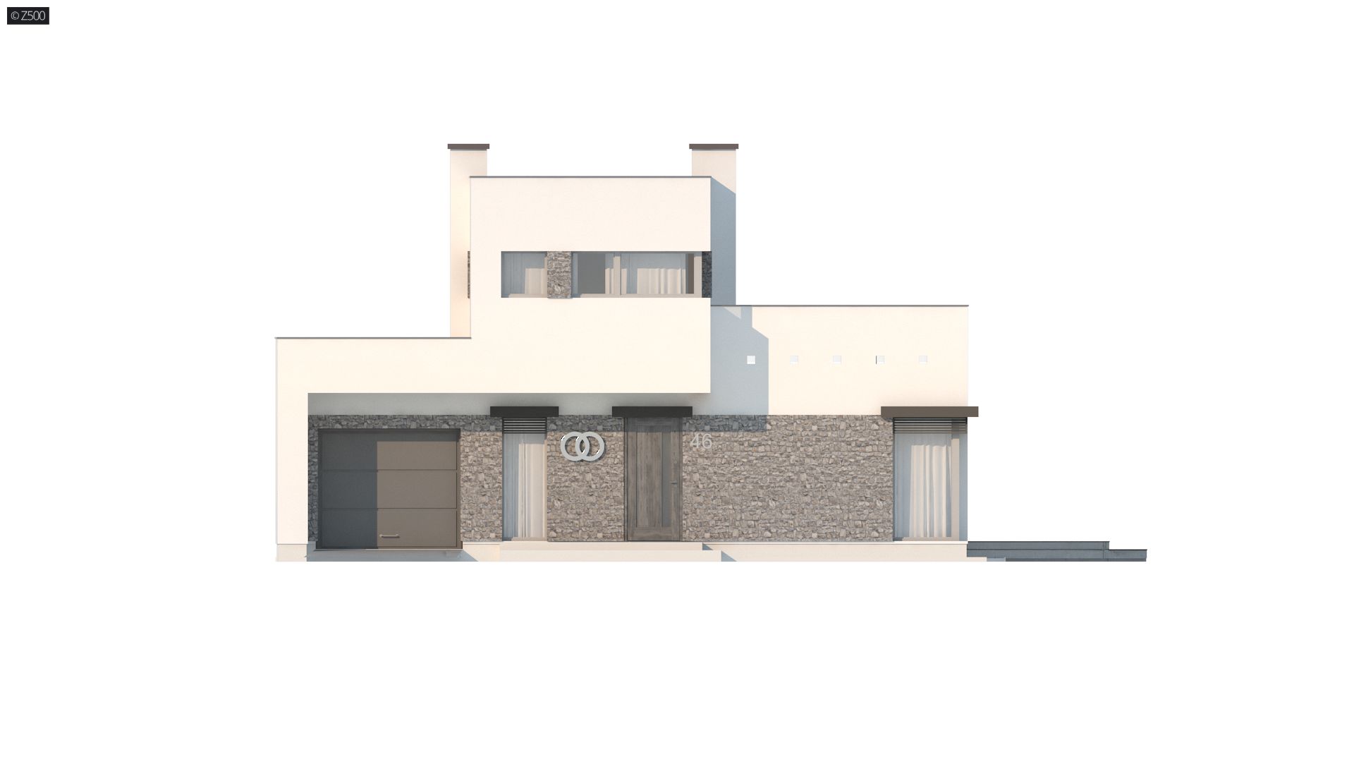 Projekt nowoczesnego domu Zx46- wyróżnia się ciekawą, kubiczną bryłą oraz detalami z jasnego kamienia.