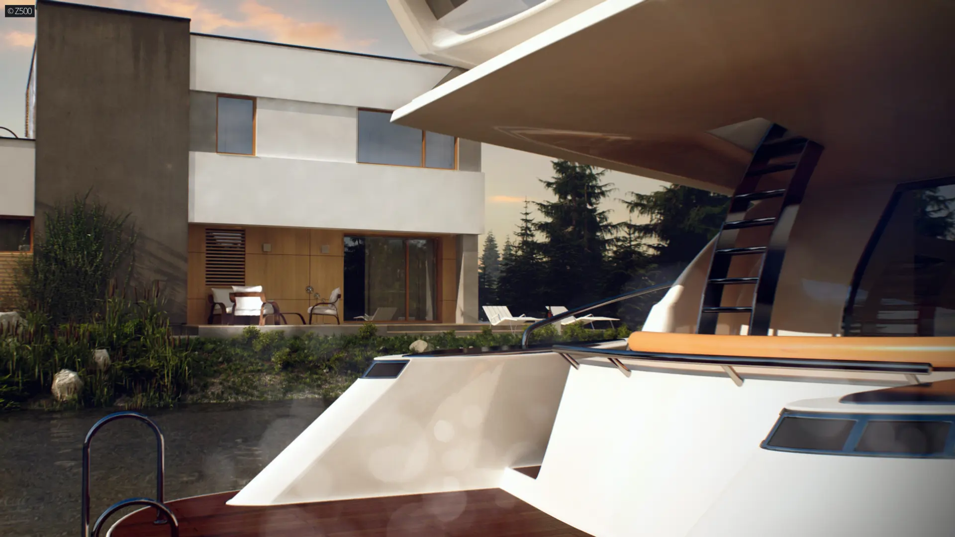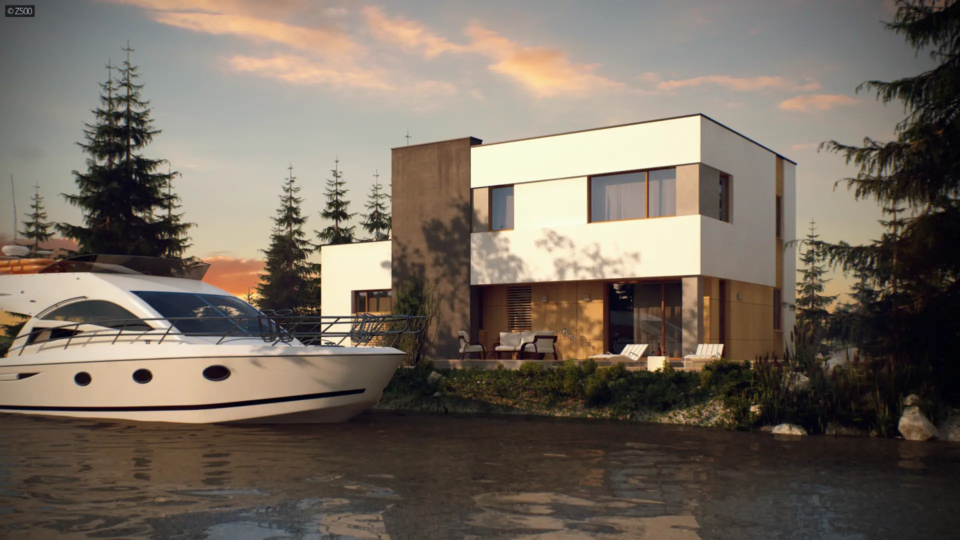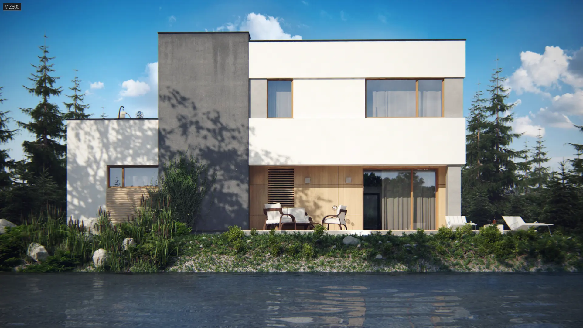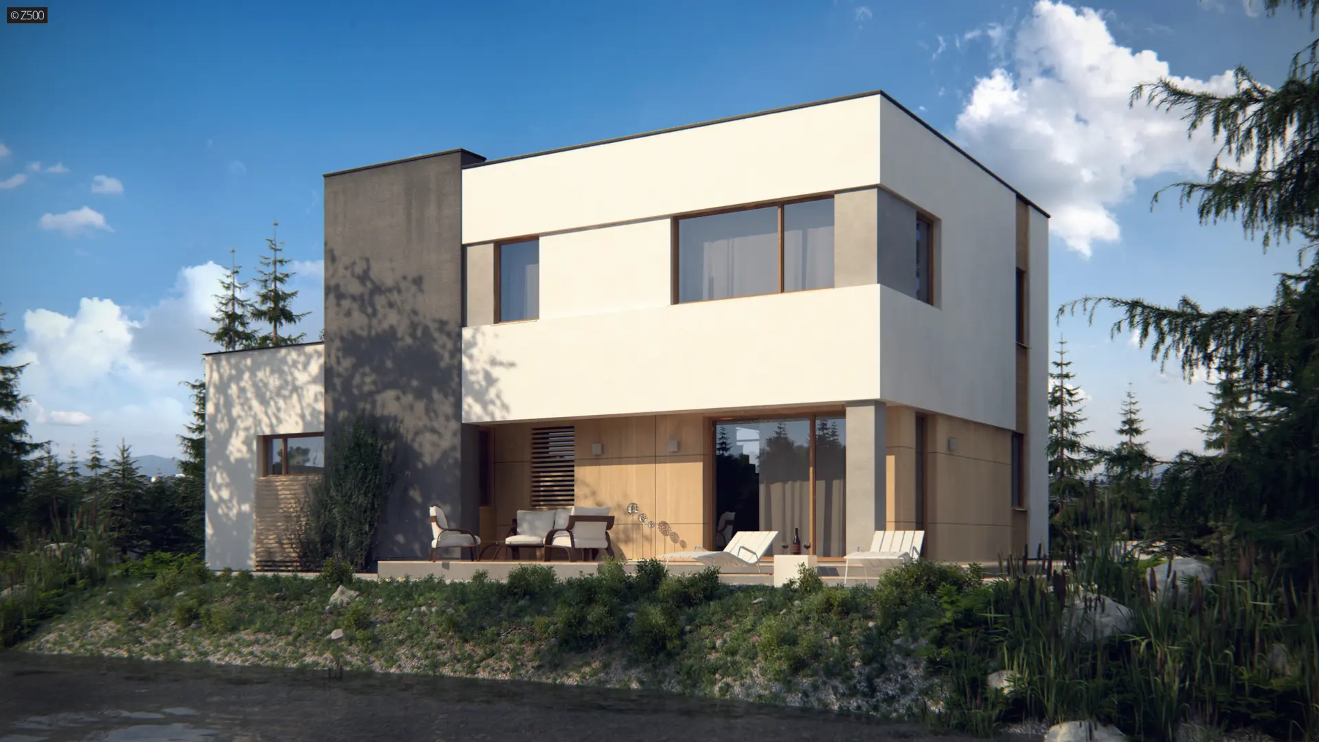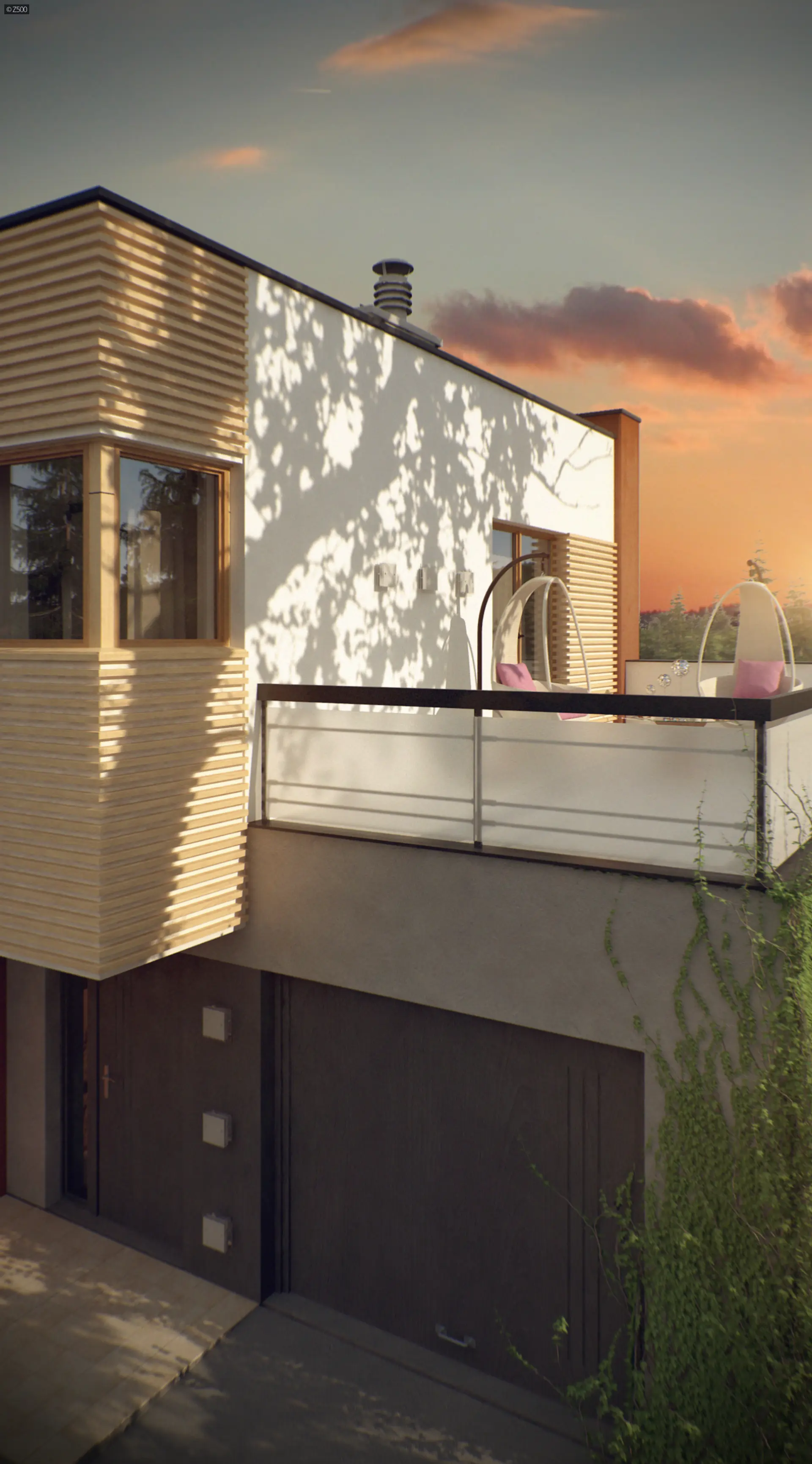Zx59 to dom zaprojektowany w duchu modernistycznej architektury. Okładziny elewacyjne z naturalnego drewna oraz ciekawa kolorystyka podkreślają jego nowoczesny wygląd. Oryginalnym dodatkiem jest wykusz od frontu, w którym mieści się klatka schodowa. Duże okno idealnie doświetla strefę komunikacyjną oraz podnosi walory estetyczne.