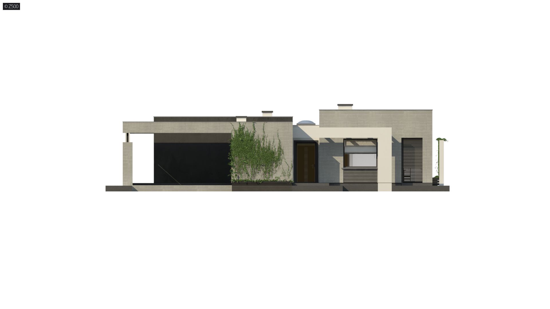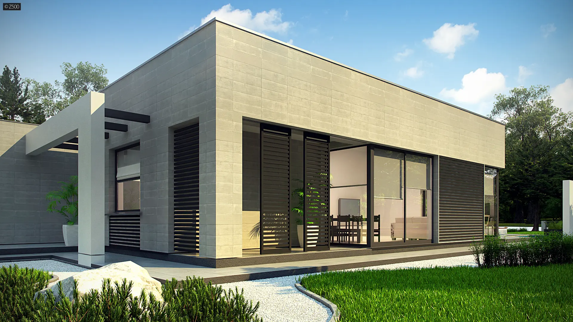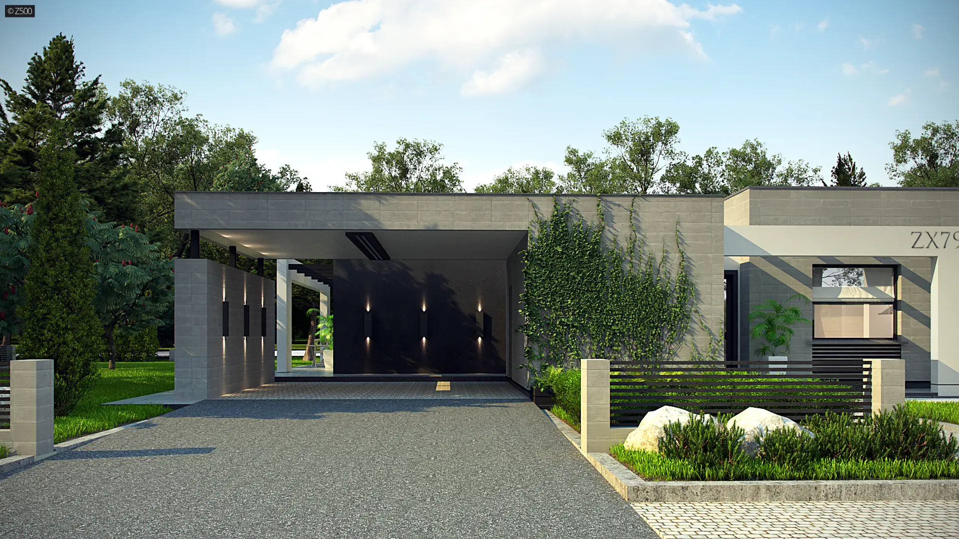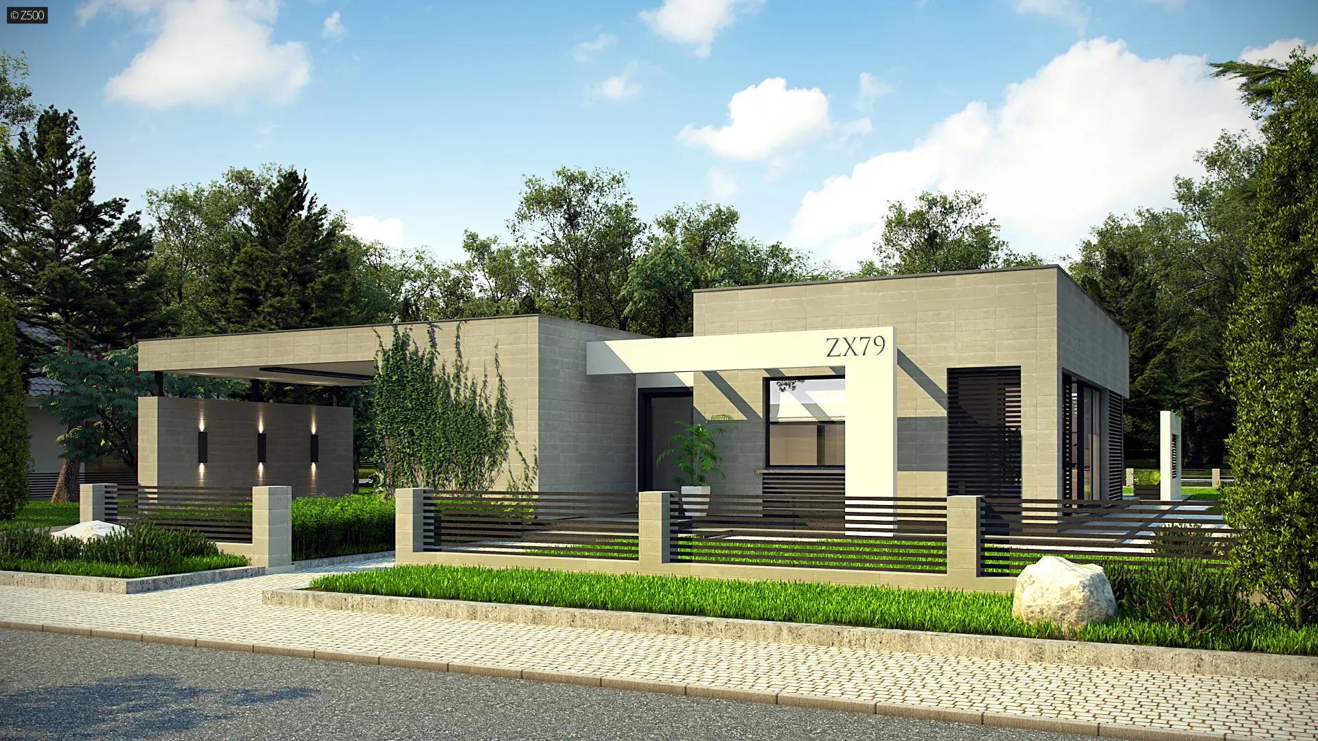 Zx79 to nowoczesny, ekskluzywny, parterowy dom w odcieniach szarości z dużymi przeszkleniami i prostymi, dekoracyjnymi elementami służącymi jako zadaszenie. Elewacja została urozmaicona o poziome żaluzje. W całym domu zaprojektowano duże przeszklenia do podłogi, będące jednocześnie wyjściami tarasowymi. Cała bryła została zaprojektowana jako 3 odrębne sześciany, których ogniwem łączącym jest korytarz. Pierwszy sześcian to część techniczna – wiata na dwa stanowiska postojowe z pomieszczeniem gospodarczym. Z prawej strony znajduje się przejście do domu. Drugi sześcian to strefa dzienna, trzeci zaś – nocna.