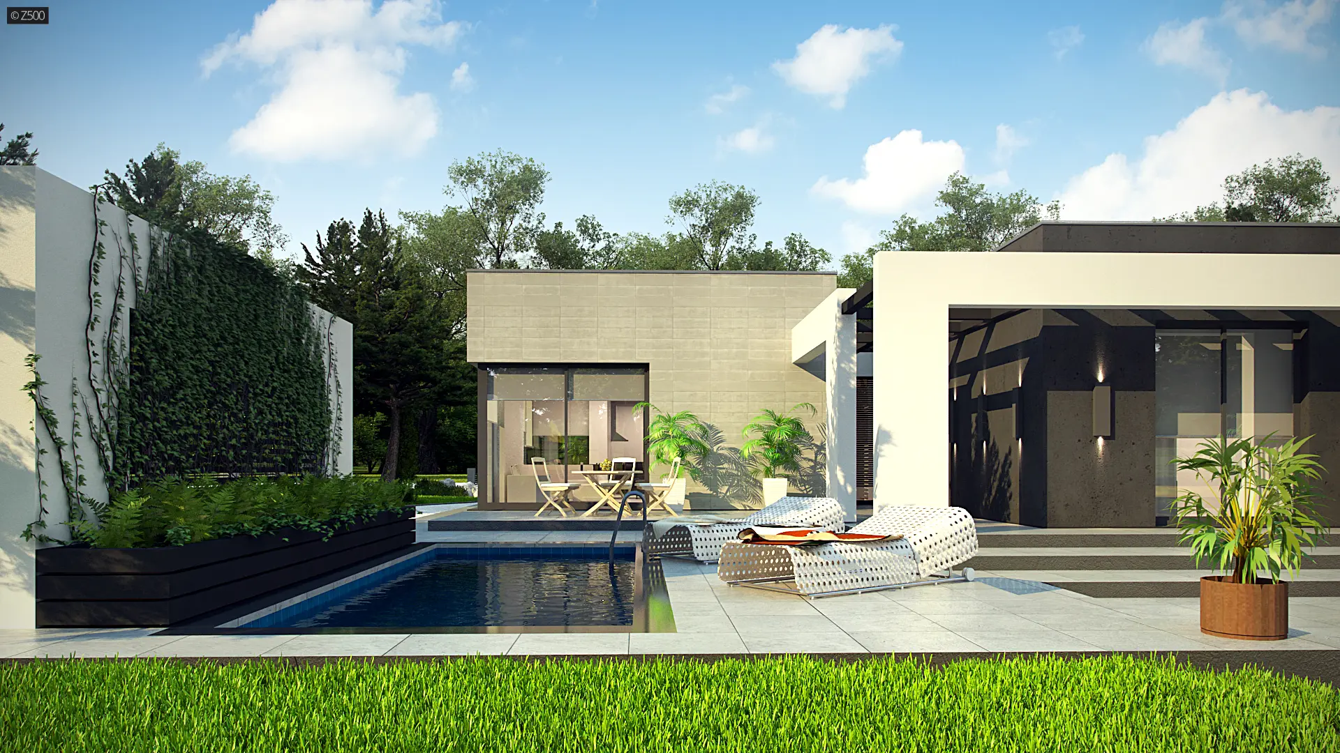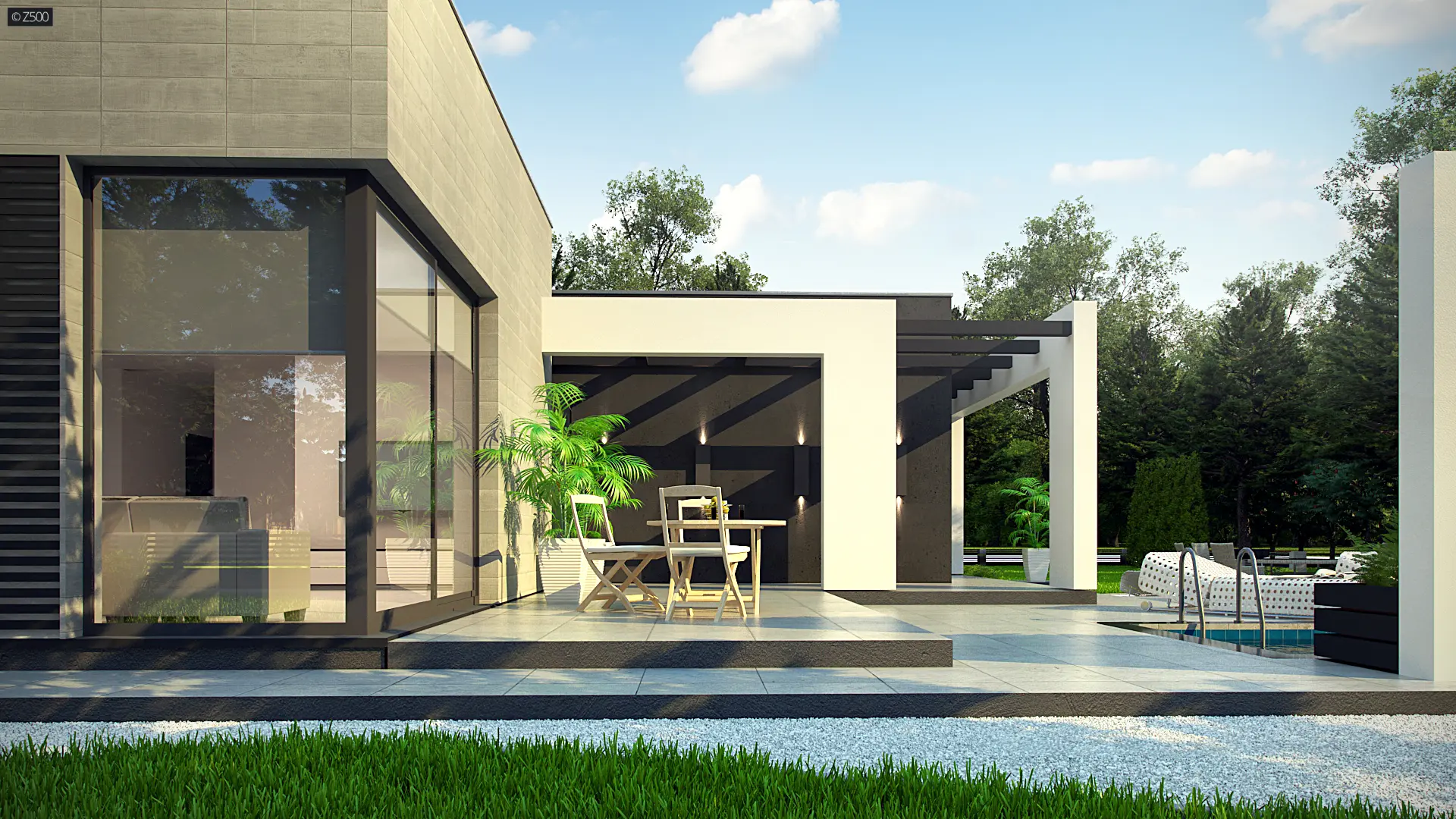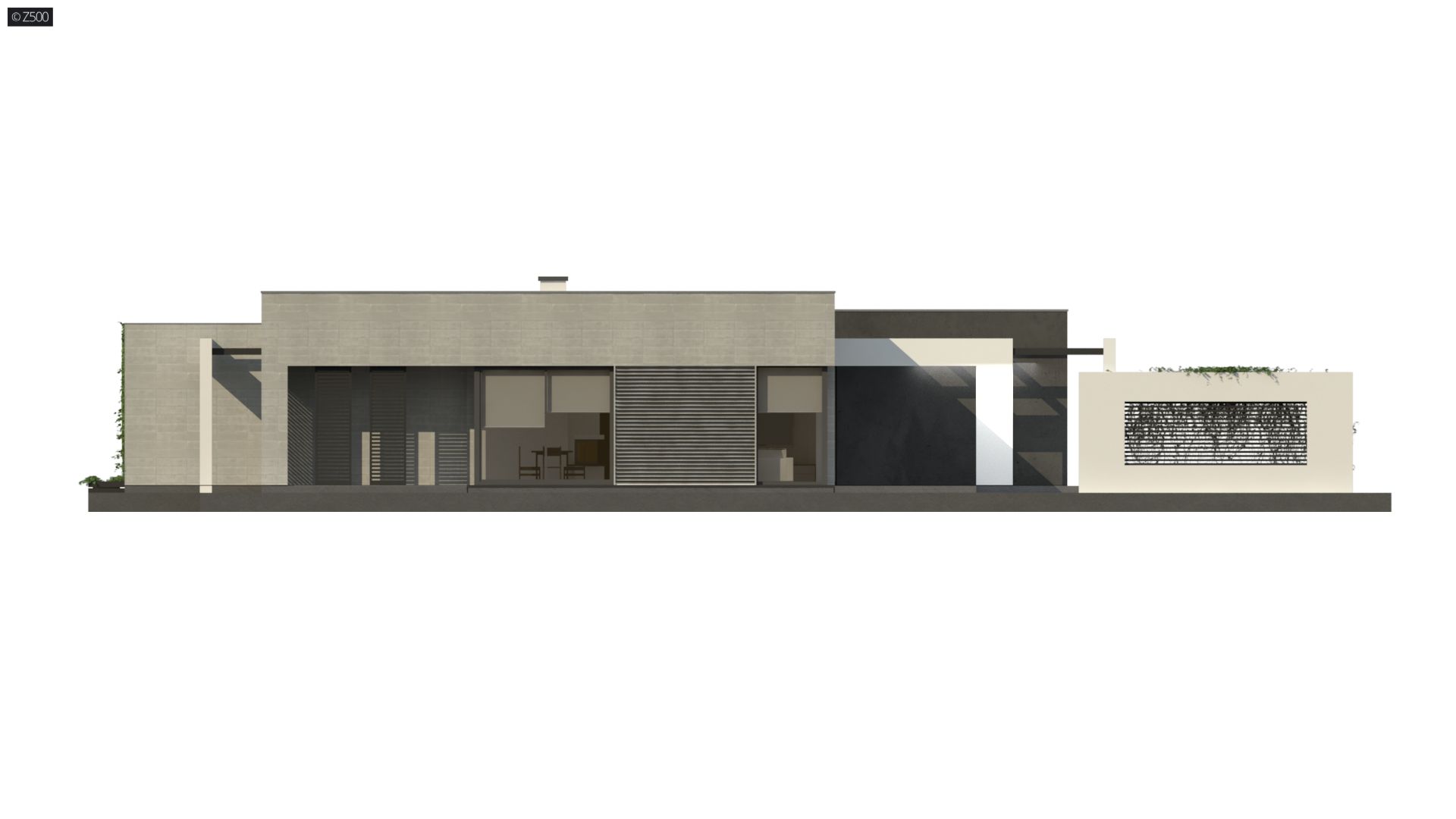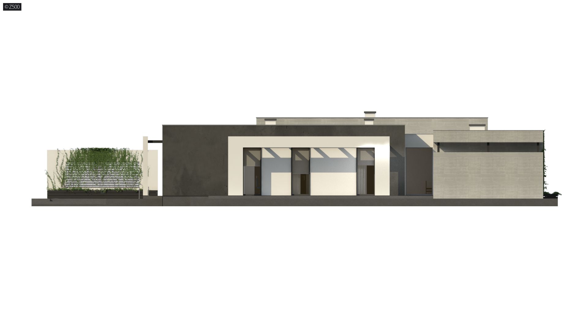 Zx79 to nowoczesny, ekskluzywny, parterowy dom w odcieniach szarości z dużymi przeszkleniami i prostymi, dekoracyjnymi elementami służącymi jako zadaszenie. Elewacja została urozmaicona o poziome żaluzje. W całym domu zaprojektowano duże przeszklenia do podłogi, będące jednocześnie wyjściami tarasowymi. Cała bryła została zaprojektowana jako 3 odrębne sześciany, których ogniwem łączącym jest korytarz. Pierwszy sześcian to część techniczna – wiata na dwa stanowiska postojowe z pomieszczeniem gospodarczym. Z prawej strony znajduje się przejście do domu. Drugi sześcian to strefa dzienna, trzeci zaś – nocna.