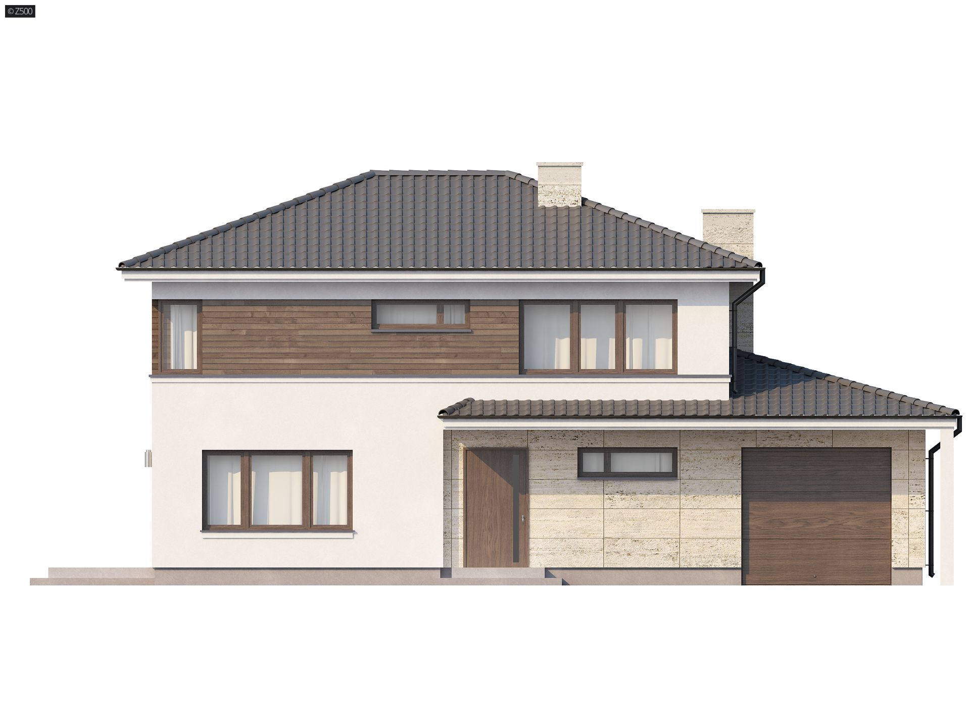 Zx8 to projekt piętrowego domu nowoczesnego z lekką nutką klasyki. Prosta bryła została wzbogacona eleganckimi dodatkami na elewacjach. Dom posiada jednostanowiskowy garaż bocznie usytuowany z ciekawą formą zadaszenia nad wjazdem.