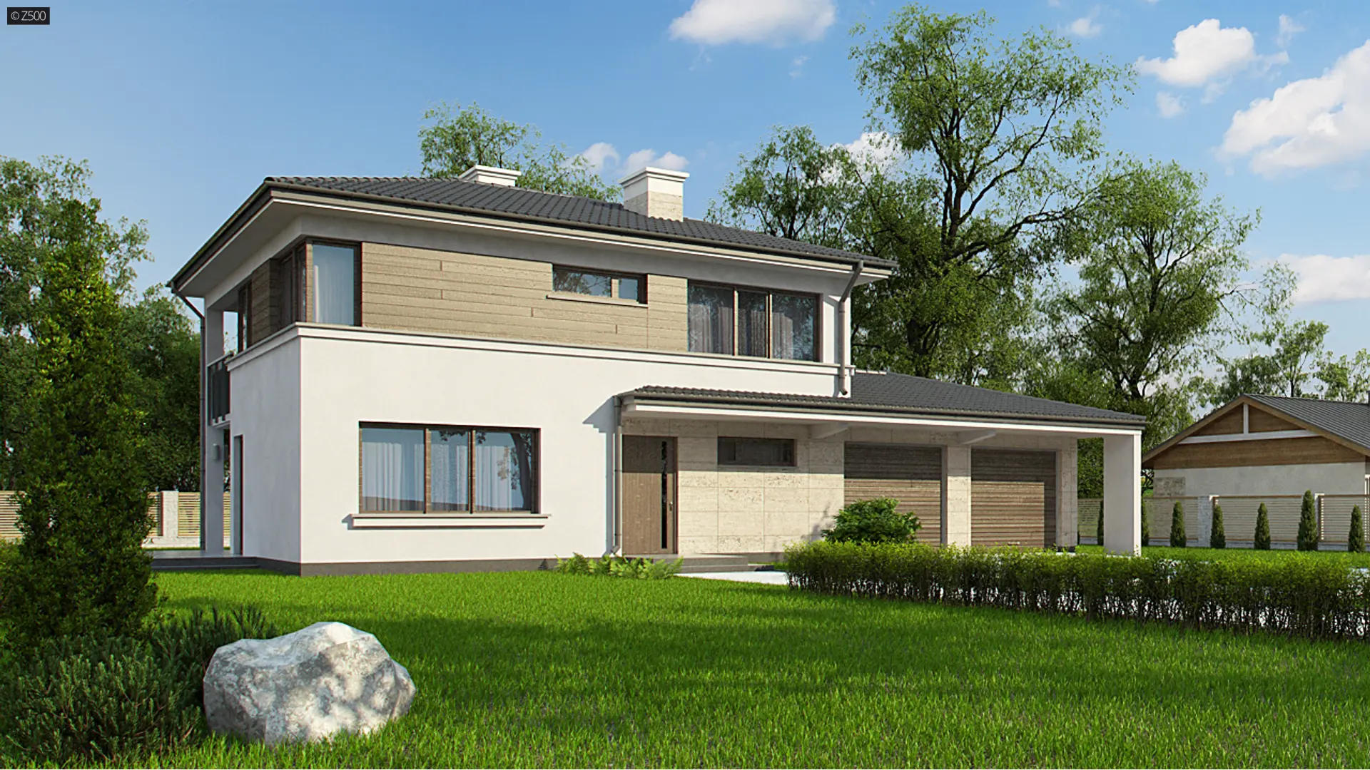 z garażem 2-stanowiskowym z prawej strony