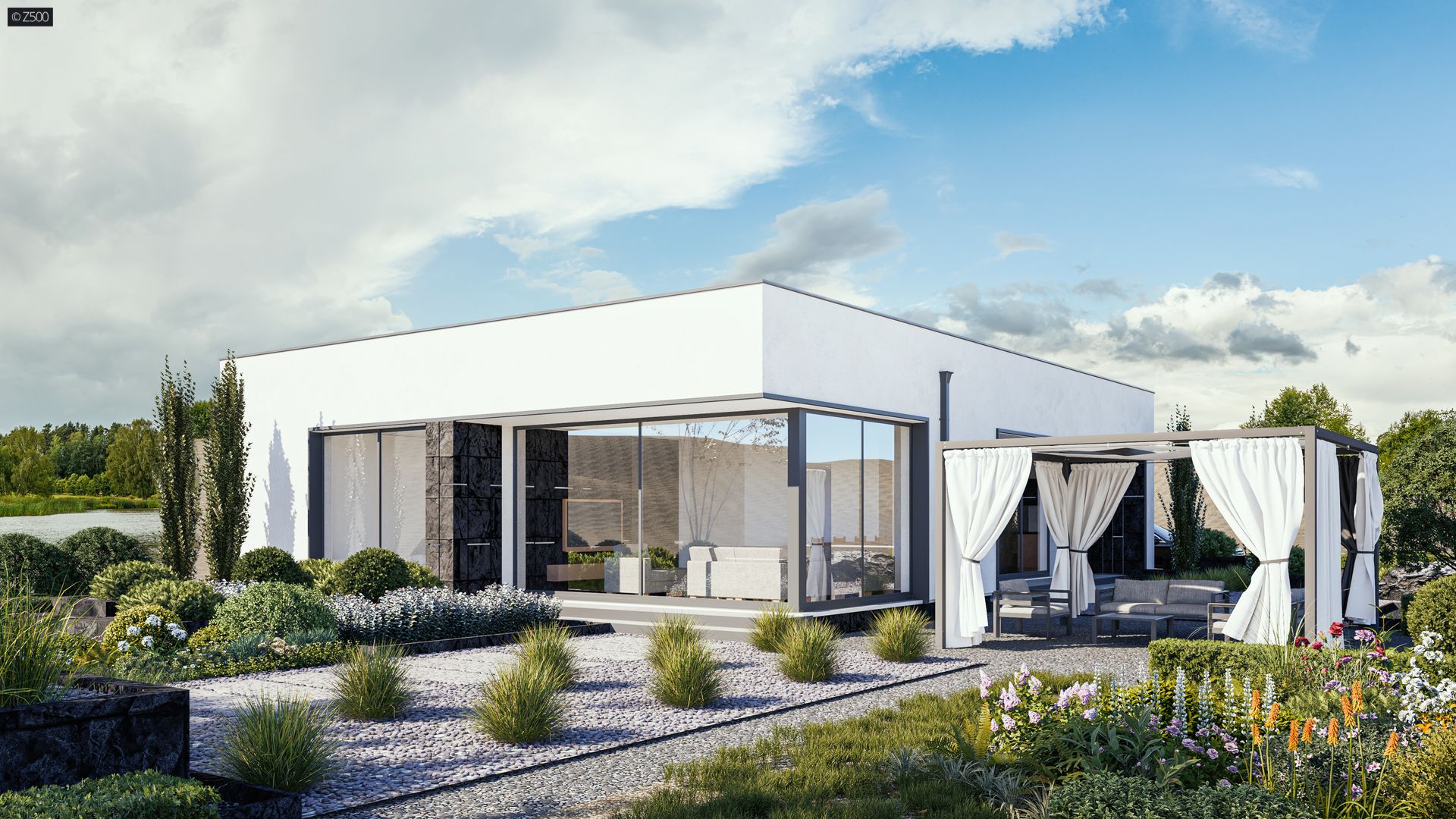 To projekt nowoczesnego domu parterowego otwartego na ogród znajdujący się od frontu budynku. Prosta bryła prostopadłościanu z podcieniami została ozdobiona nowoczesnym kamieniem i ciemną blachą.