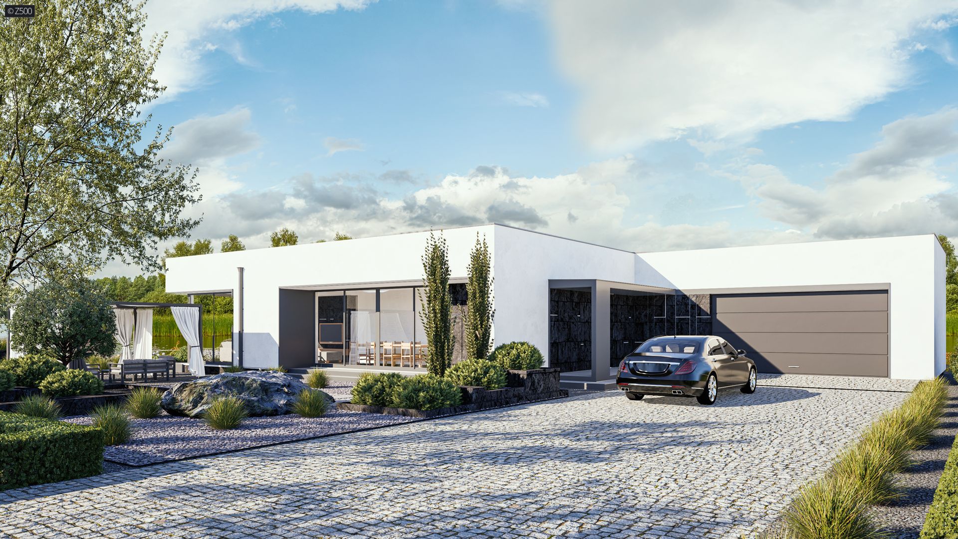 Nowoczesny dom parterowy z płaskim dachem i garażem na 2 samochody.