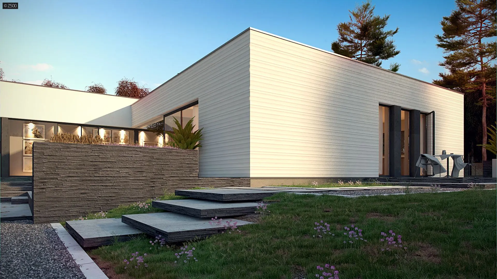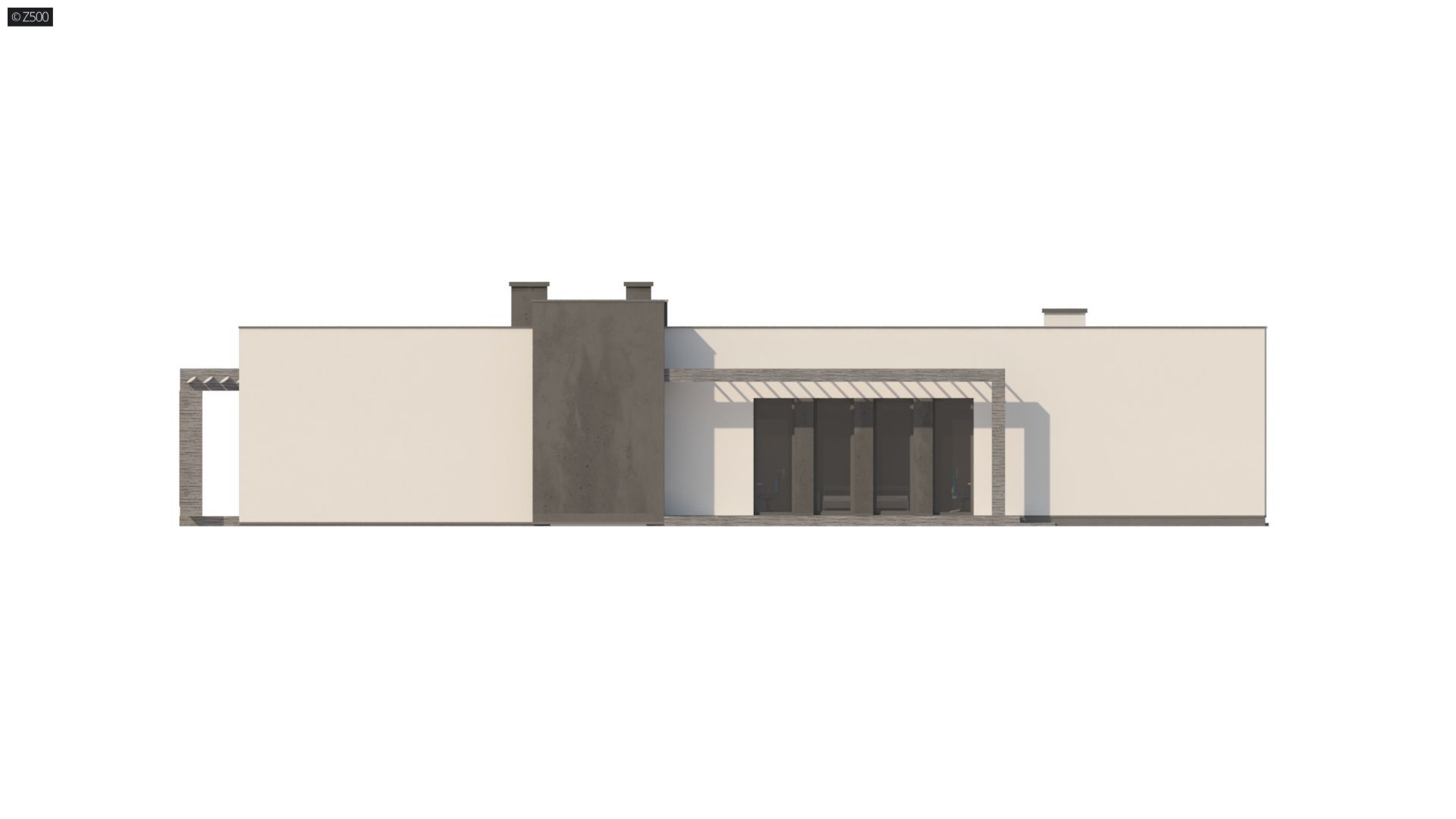 Nowoczesny dom parterowy na rzucie litery L, o surowej elewacji, gładkim białym tynku łączonym z tynkiem fakturowanym lub płytami elewacyjnymi. Dla kontrastu zastosowano ciemną stolarkę oraz elementy zacieniające. Płaski dach oraz bryła składająca się z 3 sześcianów o różnej wysokości, to kolejne elementy innowatorskiego stylu architektury.