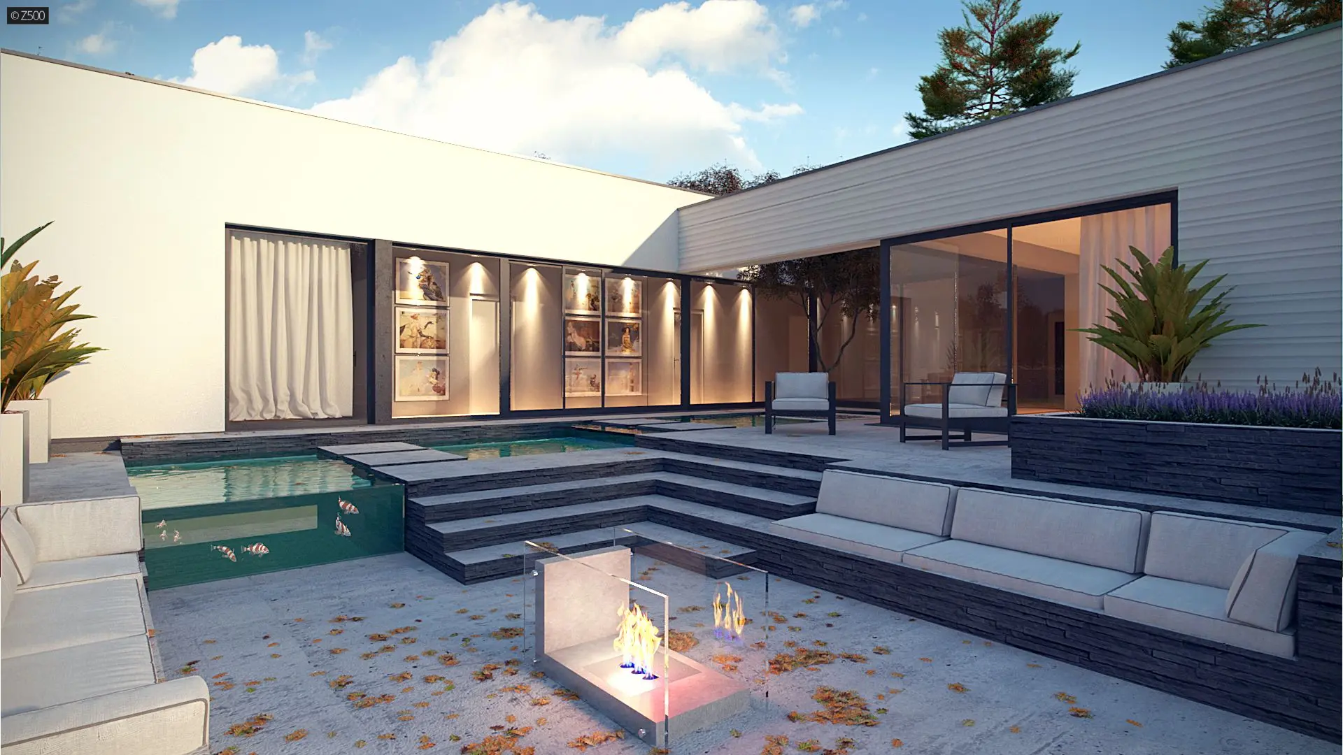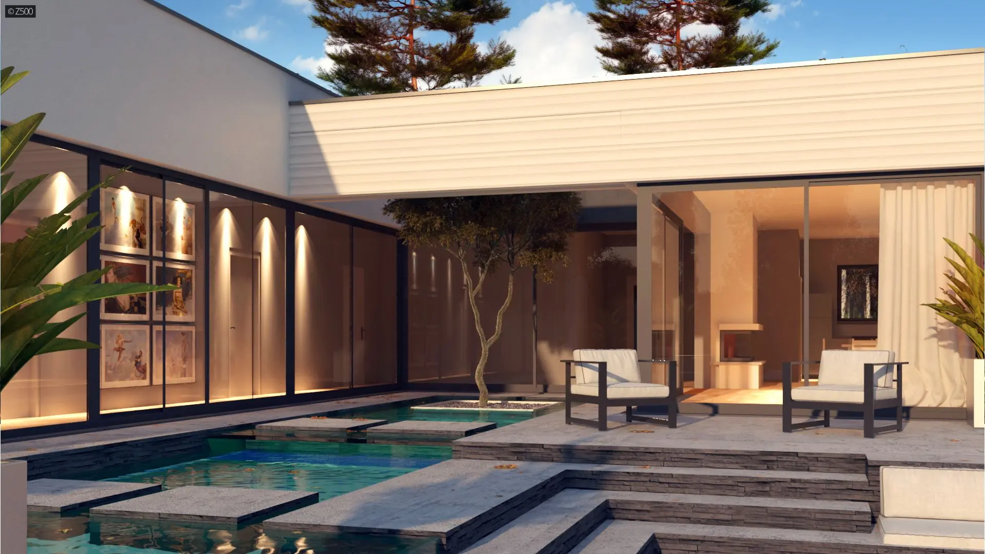 Część frontową stanowi 2 stanowiskowy garaż z pomieszczeniem gospodarczym z pompą ciepła. Po wejściu do domu jawi się piękny widok przeszklonej ściany korytarzowej oraz części salonowej. Stanowi to wspaniałą kompozycję a przeszklone, widne, jasne połączenie z ogrodem jest dodatkowym atutem projektu. Na tarasie umieszczono niewielki, wąski basen, który służy jako relaks i odprężenie.